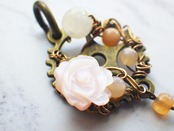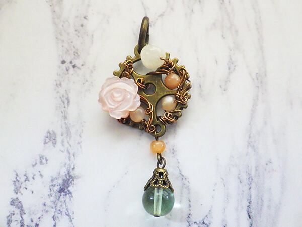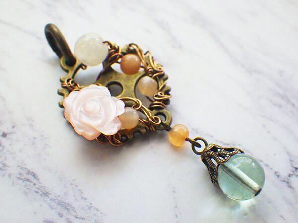 歯車に巻き付くようにバラやビーズをあしらったペンダントです。