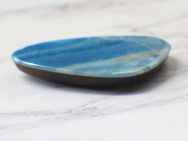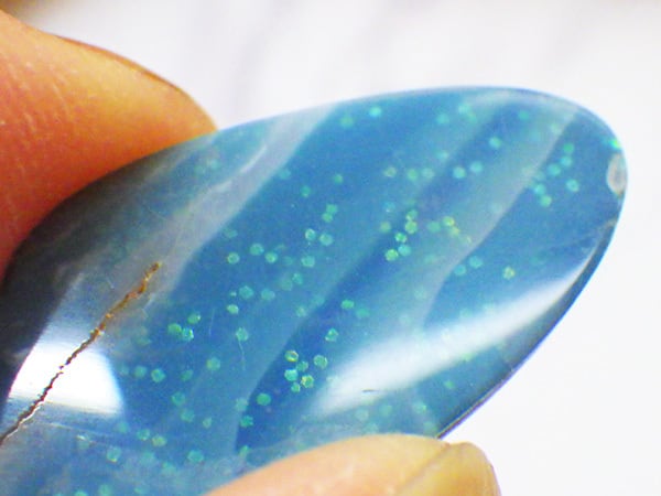 鮮やかなブルーの石に浮かぶ游色が美しいピースになります。
