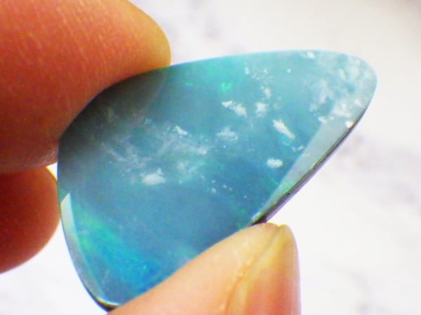 鮮やかなブルーの石に浮かぶ游色が美しいピースになります。