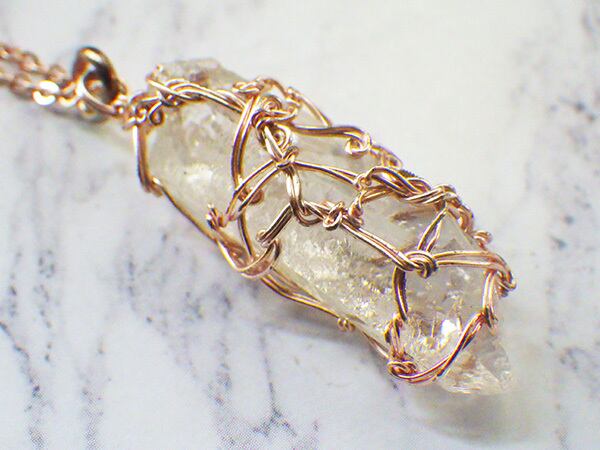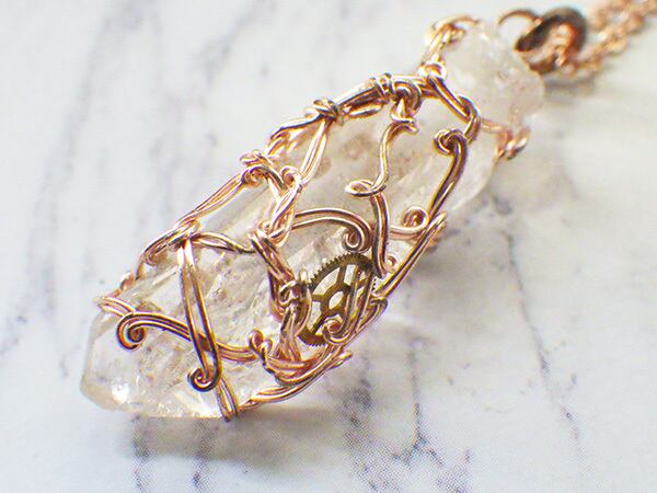 透明度の高いトマスゴンサガ産の水晶を本物の時計に使われていた歯車と一緒にワイヤーで巻きました。